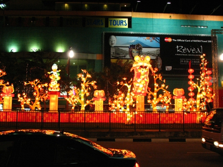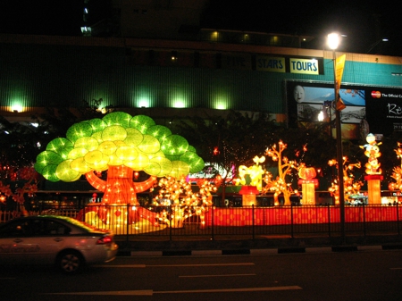 牛車水彩燈節(jié)活動(dòng)的主題是“桃滿花香牛車水,福豬迎春賀新歲”。春節(jié)的燈飾是歷年來(lái)最多的,包括406盞福豬彩燈、466盞蟠桃彩燈、1000盞印有十二生肖圖案的金幣彩燈及8處大型燈組。